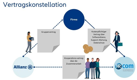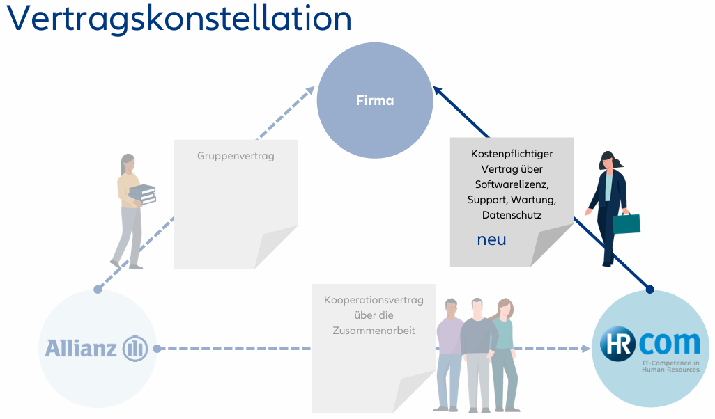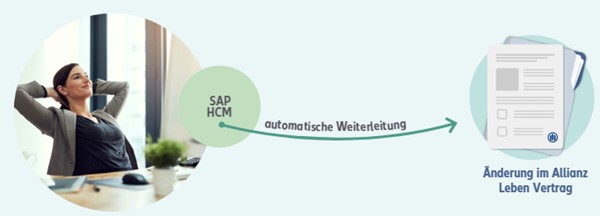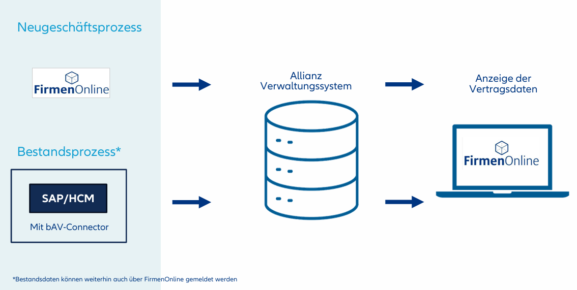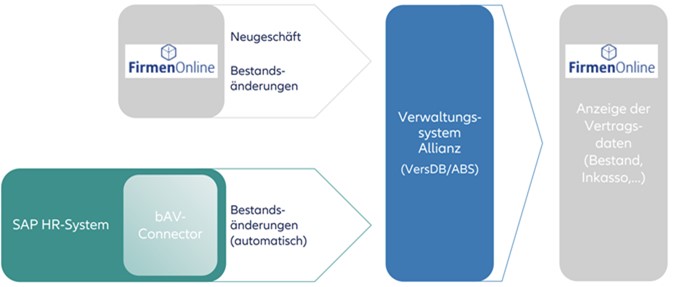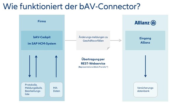 Der bAV-Connector ist für Firmen mit mindestens 500 Mitarbeitern geeignet und stellt eine Erweiterung des bestehenden SAP HCM (Personalverwaltungssystem) einer Firma dar. Er sorgt für eine automatische und sichere Übertragung von vertragsrelevanten Daten aus dem SAP HCM an die Allianz Lebensversicherungs-AG. Dabei handelt es sich z.B. um Beitragsänderungen, Adressänderungen und Wiederinkraftsetzungen. Eine einfache Bedienbarkeit wird erreicht, indem sich der „bAV-Connector“ in die gewohnte SAP-Umgebung der Firma integriert. Mit dem bAV-Connector entfällt die Doppeleingabe, da die geänderten Daten automatisch aus dem SAP HCM an die Allianz übermittelt werden. Diese Lösung wird von unserem Kooperationspartner und SAP-Partner "HR-Com GmbH" zur Verfügung gestellt.
